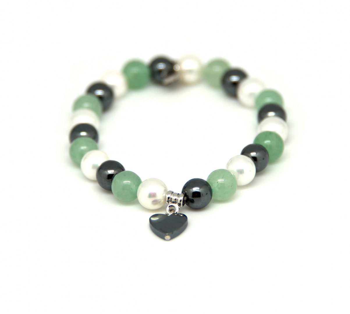 Elastisk armbånd med hematitt, aventurin og hvite perler, og ett hjerte.