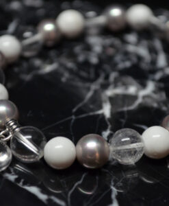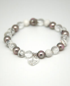 Elastisk armbånd med flott sammensetning av howlitt, kvarts og hvite perler, og et hjerte i klar bergkrystall.
