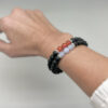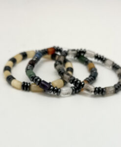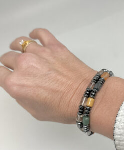 Elastisk armbånd med sylinderformede kuler i forskjellige edelsteiner og smale perler i blank hematitt. Armbåndet er i elastisk strikk av høy kvalitet.