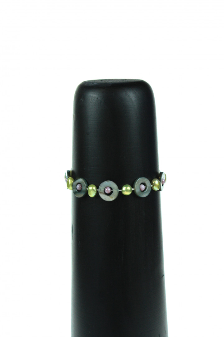 Lett, elastisk armbånd med grønne, runde skjell og rosa perler