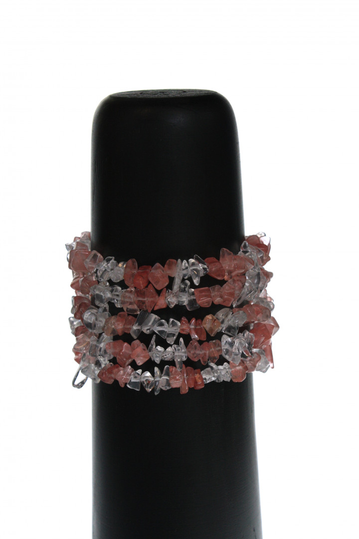 Spiral-armbånd på bøyelig wire med chips i flott kombinasjon av krystall og lyserød kvarts. 110cm langt.