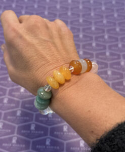 Lekkert armbånd med 15mm flate kuler. 3 av hver chakra stein og med klare bergkrystaller i mellom.