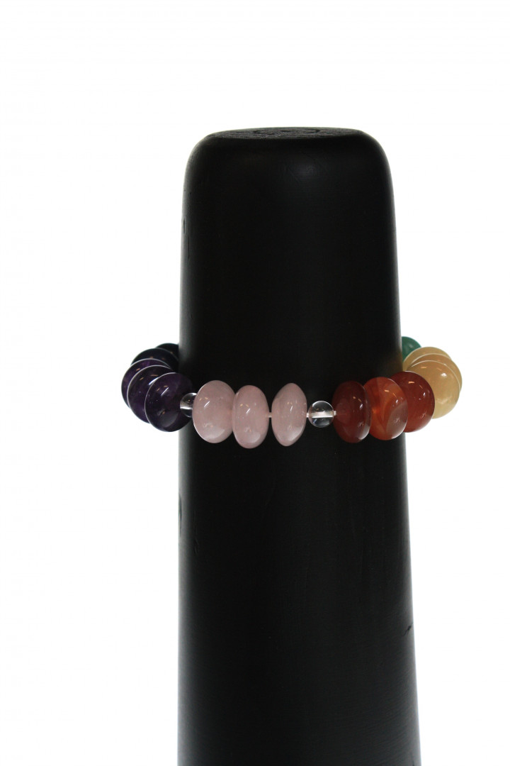 Lekkert armbånd med 15mm flate kuler. 3 av hver chakra stein og med klare bergkrystaller i mellom.