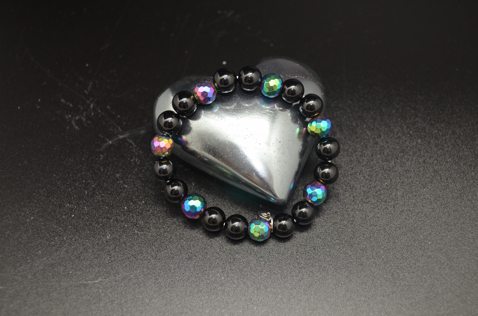 Armbånd i sort agat og facettslipte regnbuehematitt. Kraftige kuler og elastisk tråd.