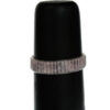 Armbånd med stor knapp og smale, sylinderformede hematitter som er bundet sammen med tykk plasttråd. Armbåndet er bevegelig og mykt.