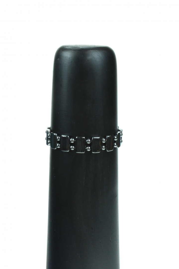 Elasktisk armbånd i blank hematitt med flate, polerte »puter» og 4mm kuler i mellom.