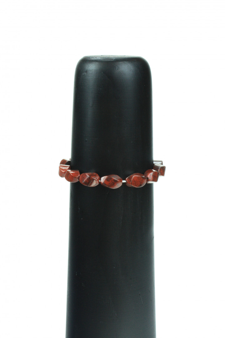 Elastisk armbånd med vridde steiner i mørk braciate jaspis, som har en variasjon av mørke rød farger.