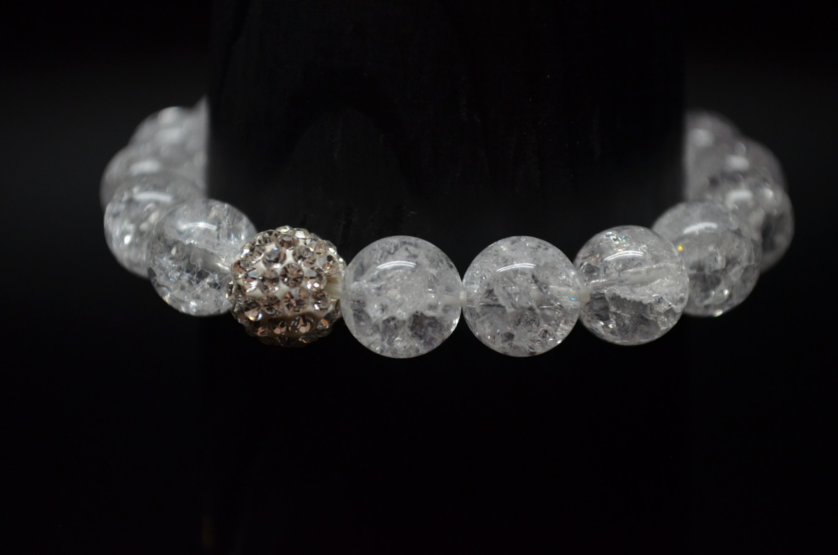 Elastisk armbånd med store kuler i knust kvarts som glitrer, og 1 skinnende zirkonkule
