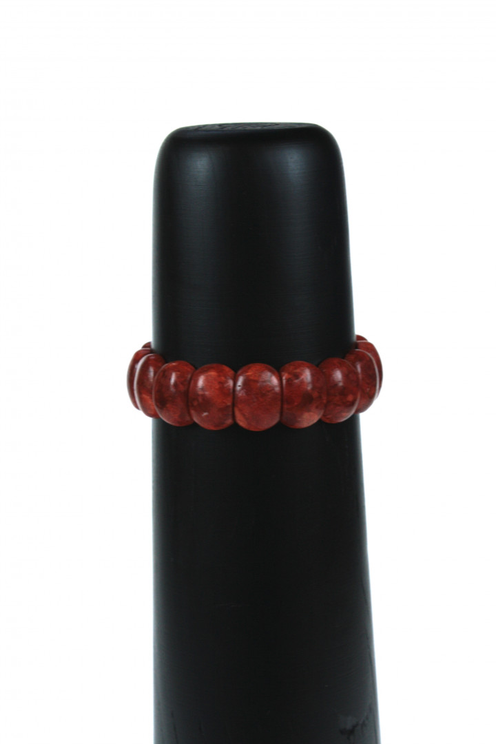 Elastisk, rødt koral-armbånd med 3 cm lange koraler.