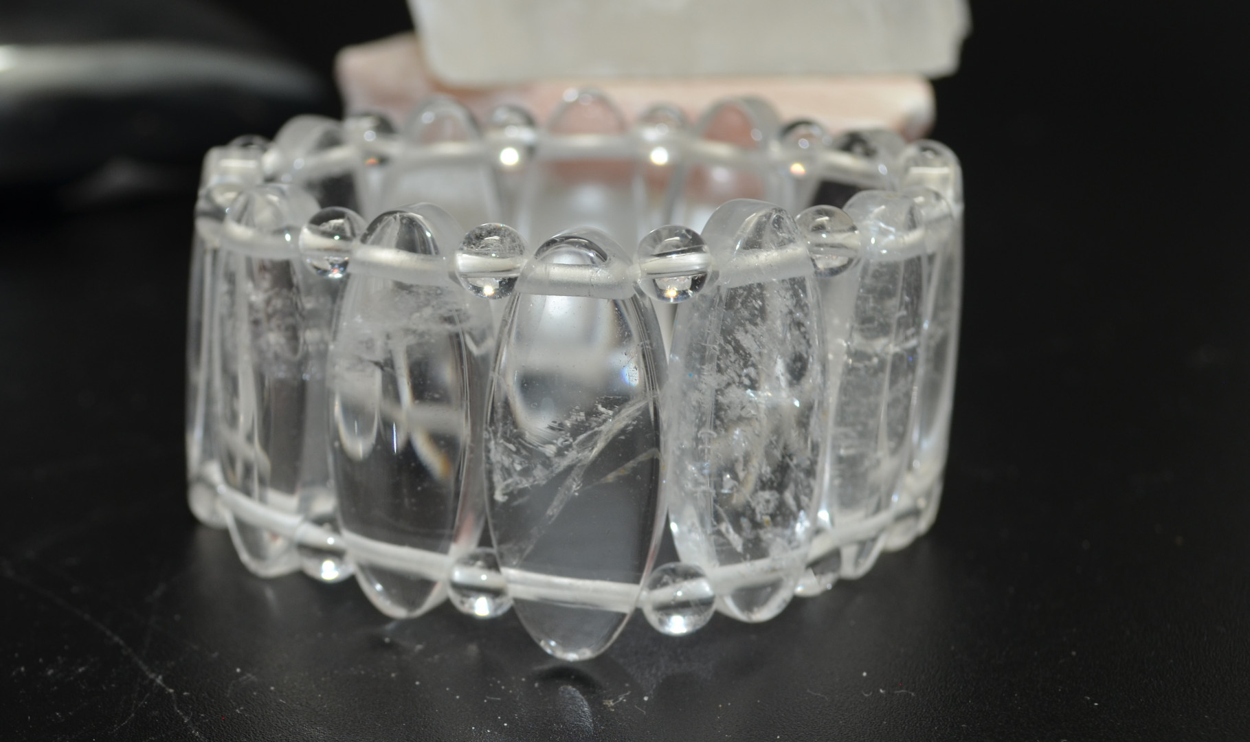 Elastisk armbånd med brede. ovale steiner i kvarts med kuler i mellom .