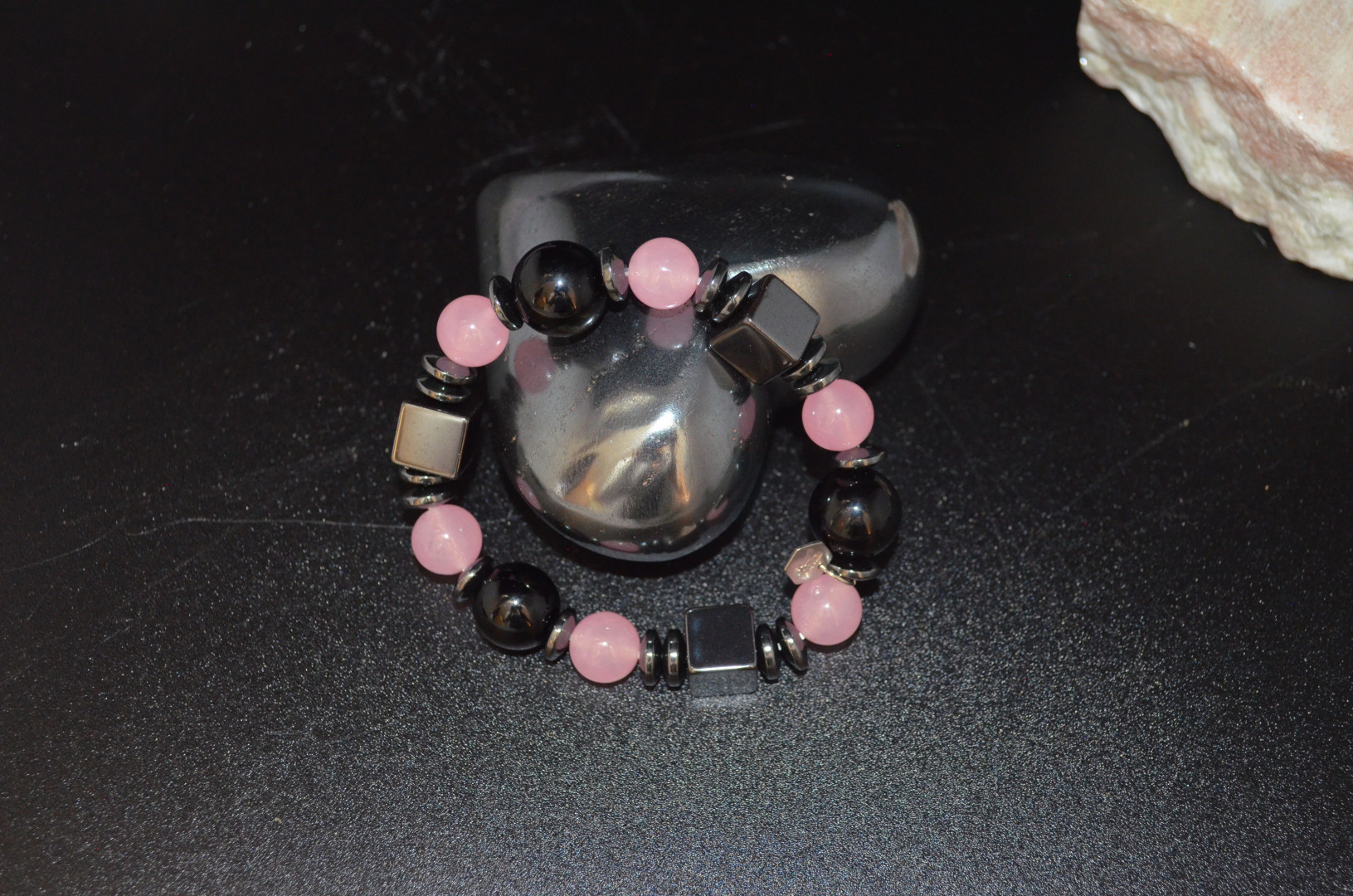 Kraftig. flott armbånd med kombinasjon av kuber i hematitt og store. rosa kuler. Elasktisk.