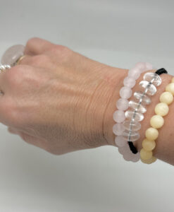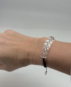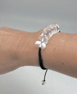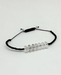 Regulerbart armbånd med kvartsknotter og flettet sort tråd.