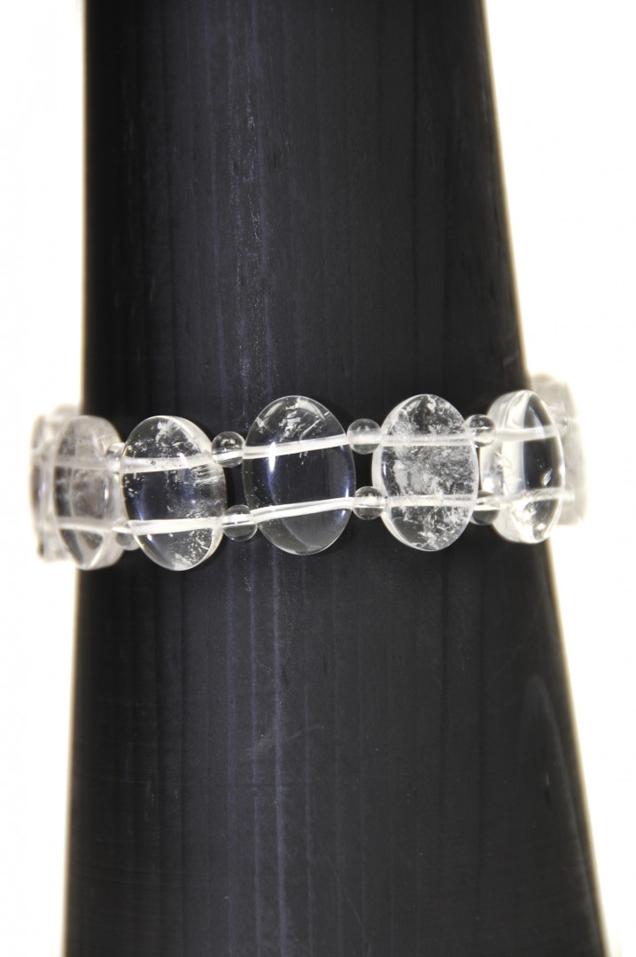 Kraftig. lekkert armbånd med flate ovale bergkrystaller sammen med små kuler. Elastisk strikk som er enkelt å at av og på.