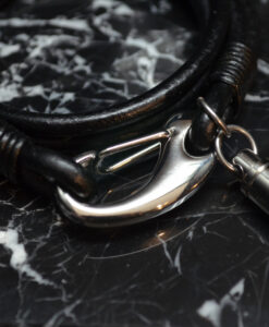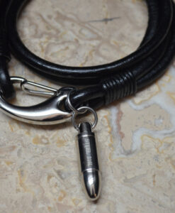 Meget tykt lærarmbånd med metallpatron som henger ned.