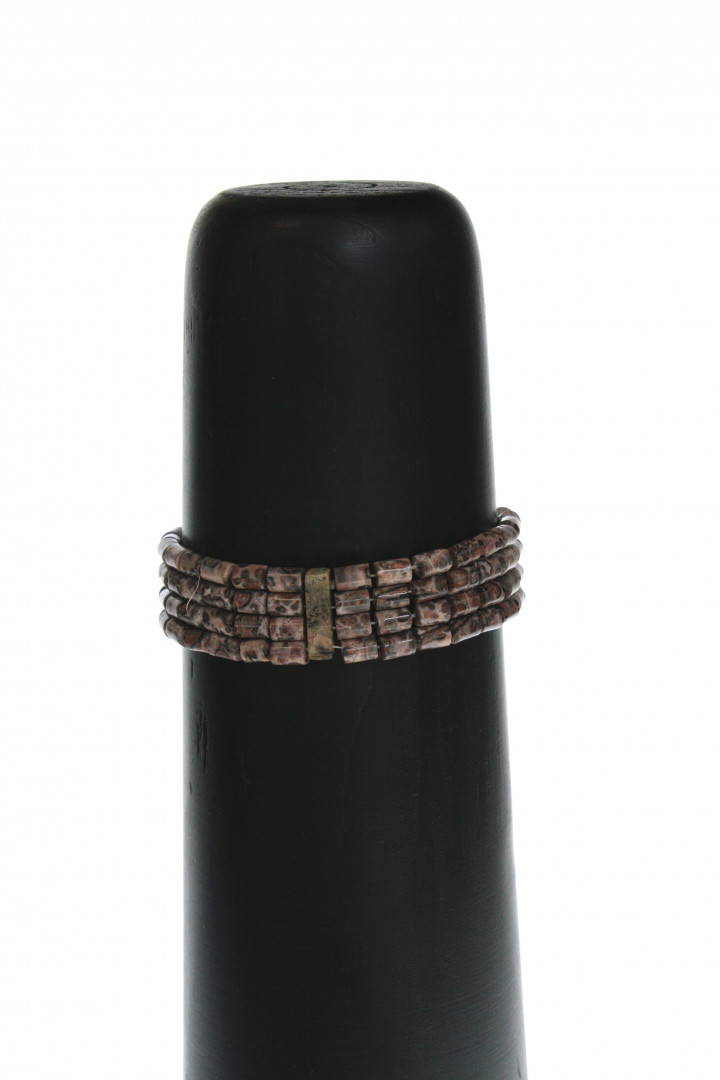 Armbånd med 4 rader av små sylinderformede leopard skin. Elastisk og min. 18cm i omkrets.