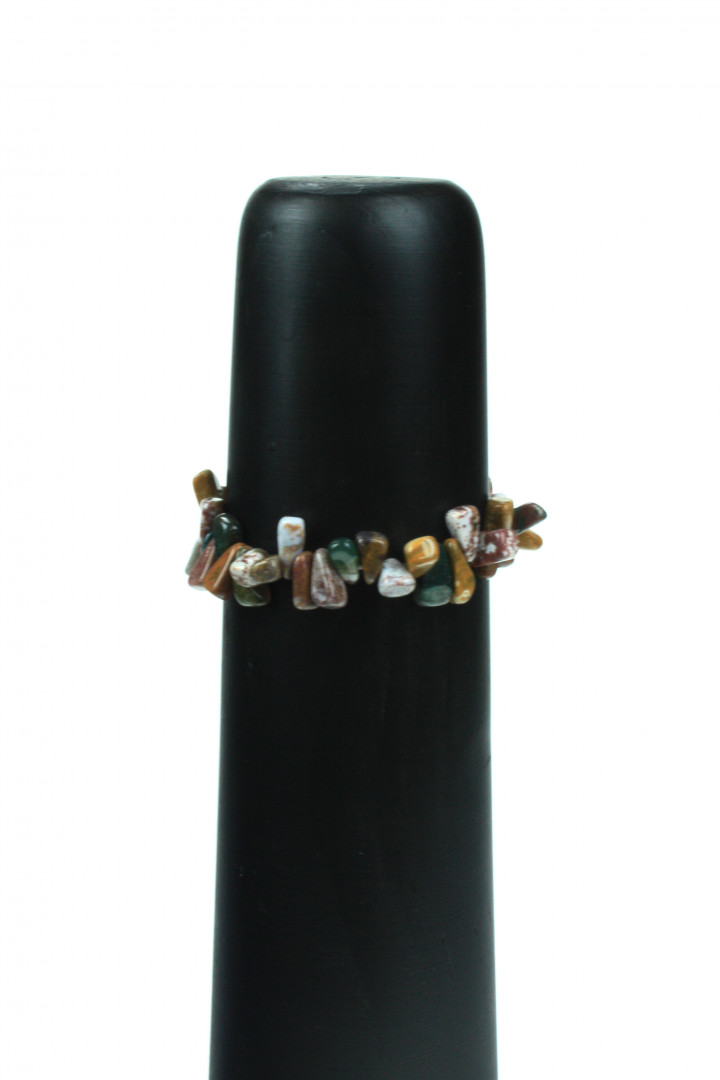 Armbånd med krafitge, uregelmessig formede chips i Ocean jaspis, som er en stein med et flott fargespill.