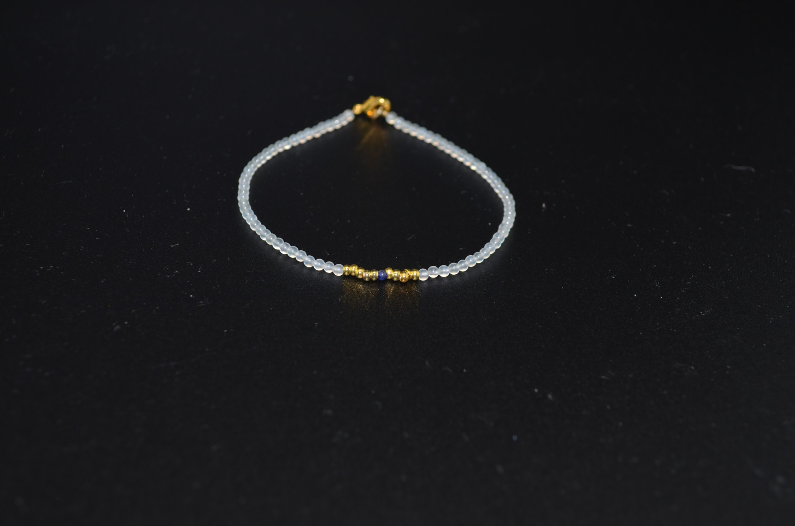 Petit armbånd med små kuler i sort agat, gullfarget metall og 1 blå lapiskule i front. Krom metallås. Armbåndet passer fint å kombinere med andre petitarmbånd eller andre armbånd med større steinkuler.