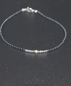 Petit armbånd med små kuler i sort agat, metall og en gul aragonittkule i front. Krom metallås. Armbåndet passer fint å kombinere med andre petitarmbånd eller andre armbånd med større steinkuler.