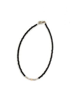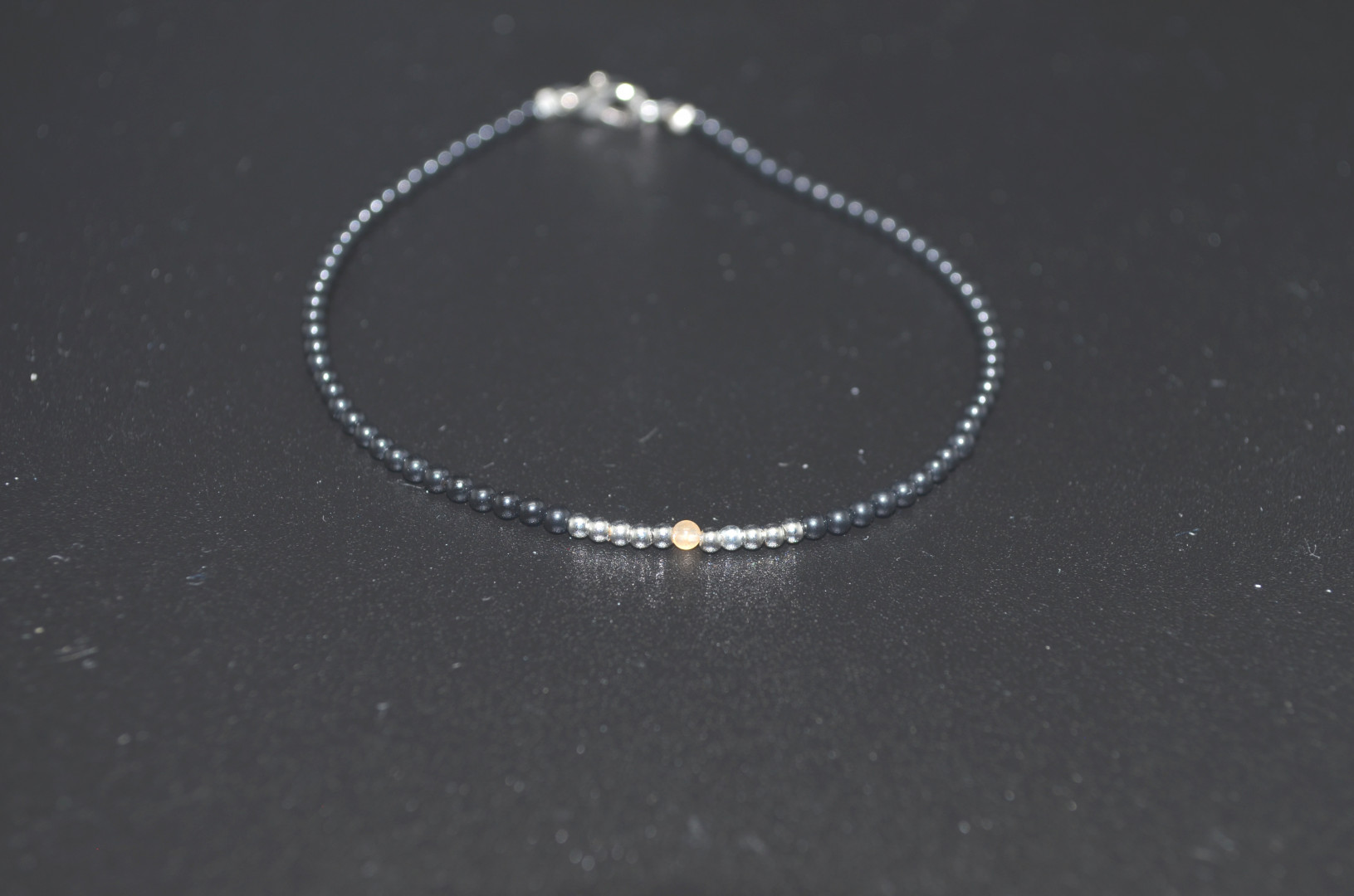 Petit armbånd med små kuler i sort agat, metall og en gul aragonittkule i front. Krom metallås. Armbåndet passer fint å kombinere med andre petitarmbånd eller andre armbånd med større steinkuler.
