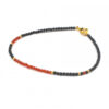 Petit armbånd med små kuler i sort agat. metall og en gul aragonittkule i front. Krom metallås. Armbåndet passer fint å kombinere med andre petitarmbånd eller andre armbånd med større steinkuler.