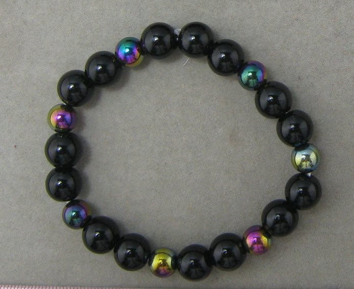 Elastisk armbånd med store, polerte kuler i sort agat. Hver tredje kule er i en mindre regnbuehematitt som gir en flott effekt.