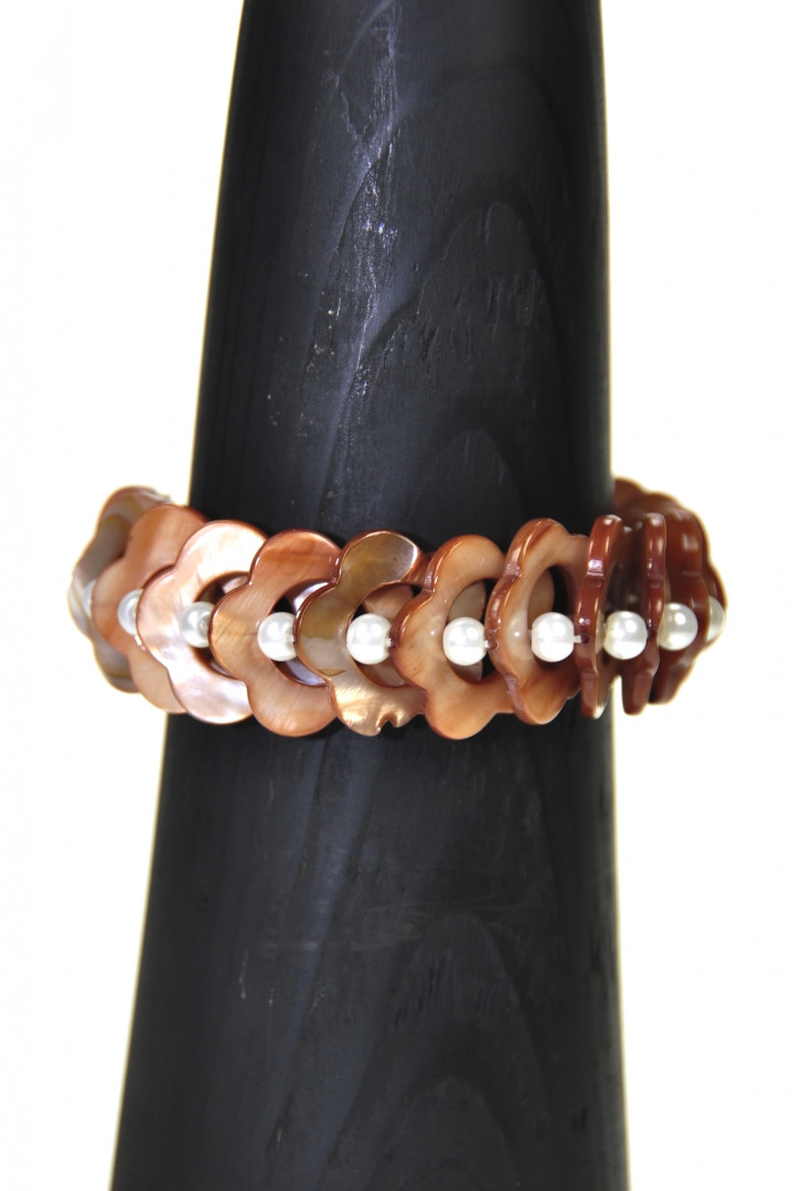Skjellarmbånd med runde brune skjell og hvite kuler.