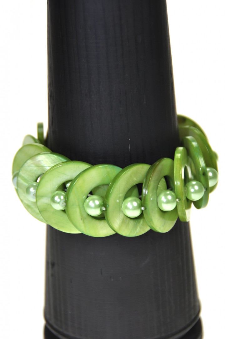 Skjellarmbånd med runde grønne skjell og hvite kuler i mellom.