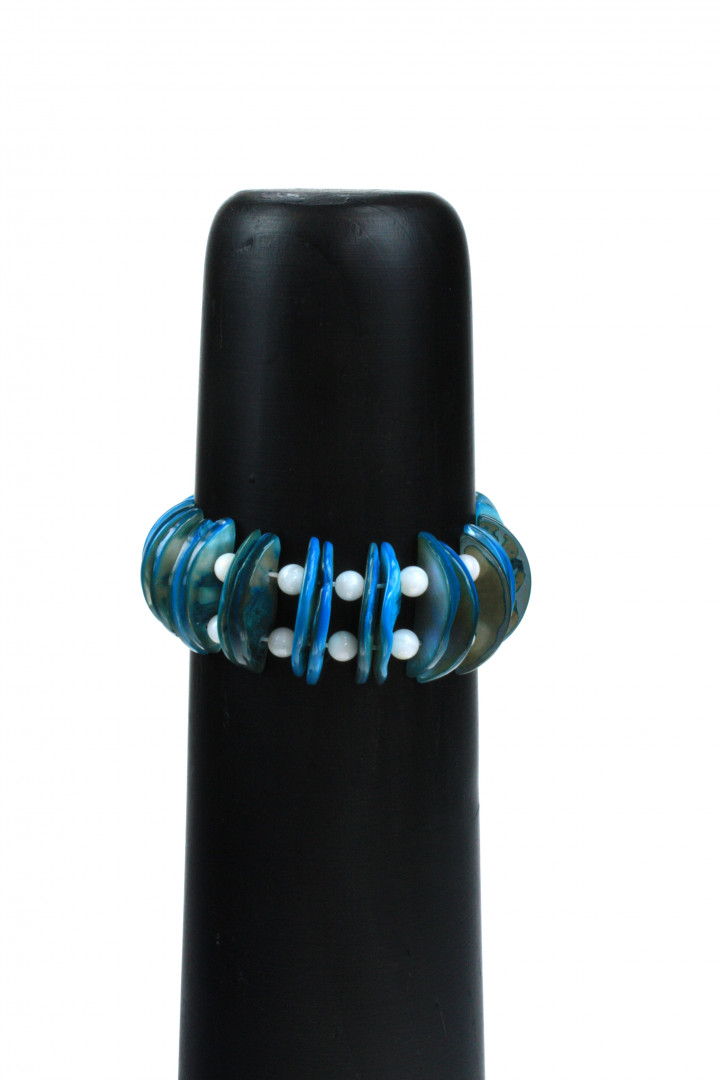 Armbånd med mørke blå skjell og hvite 4mm kuler.