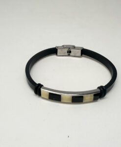 Tøft lærarmbånd med annenhver gul og sort rav som er polert. sammen med metalldetaljer. Armbåndet passer både menn og damer. Låsen er i stål helt fri for nikkel. For å endre størrelsen. tar du enkelt av låsen og klipper til lærarmbåndet til ønsket størrelse. 5mm bredt og 21 cm langt. Lær. lås og rav av høy kvalitet.