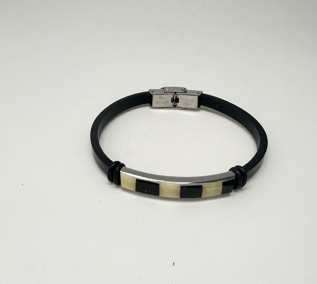 Tøft lærarmbånd med annenhver gul og sort rav som er polert, sammen med metalldetaljer. Armbåndet passer både menn og damer. Låsen er i stål helt fri for nikkel. For å endre størrelsen. tar du enkelt av låsen og klipper til lærarmbåndet til ønsket størrelse. 5mm bredt og 21 cm langt. Lær. lås og rav av høy kvalitet.