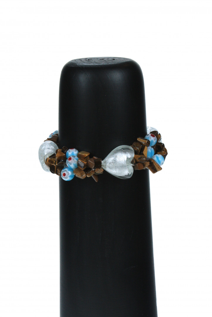 Elastisk armbånd med små og store tromlede stener i Tigerøye og hjerte.