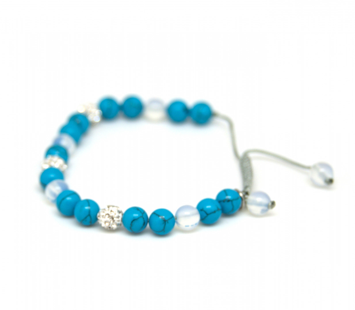 Regulerbart armbånd i turkis og opalglass med krystallkuler.