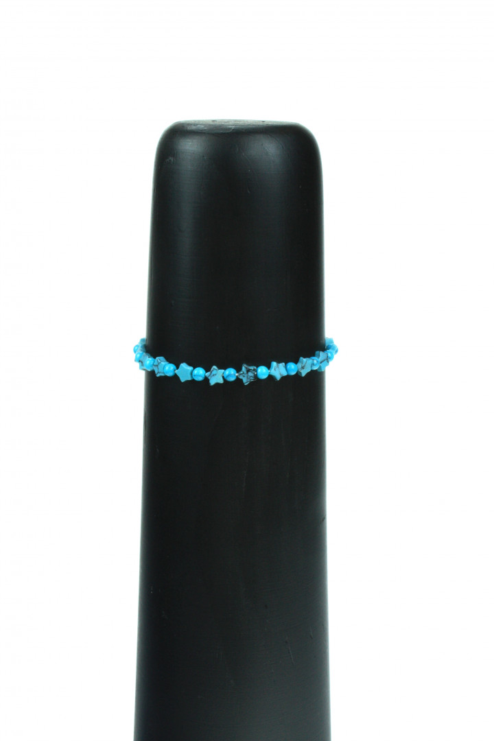 Enkelt og lett armbånd med små. flate stjerner og 4mm kuler i turkis. Elastisk stikk. liten størrelse.