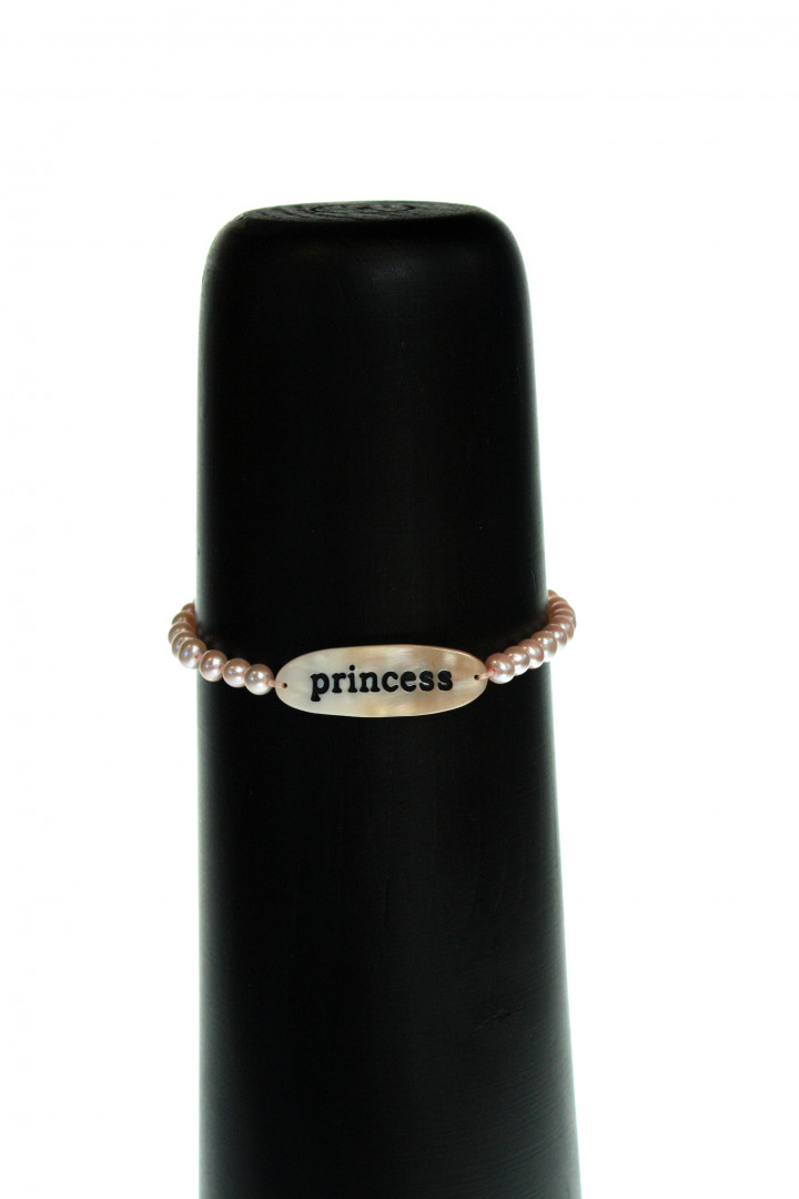 Enkelt elastisk armbånd med lyse, lette rosa perler og perlemor plate med »Princess».