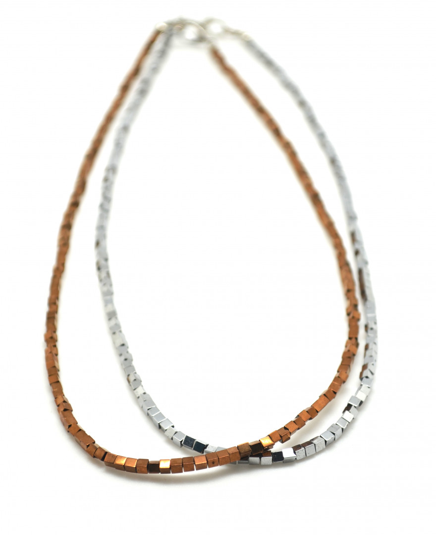 2 stk korte kjeder med små kuber i bronse og sølv. Metallås. 42cm lange.