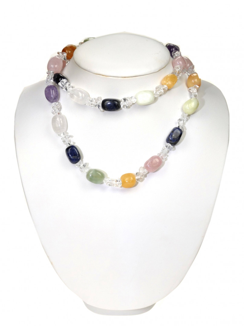 Langt kjede med nuggets i chakras stein og chips i klare bergkrystall. Kjedet har ingen lås og kan enkelt tas over hodet.