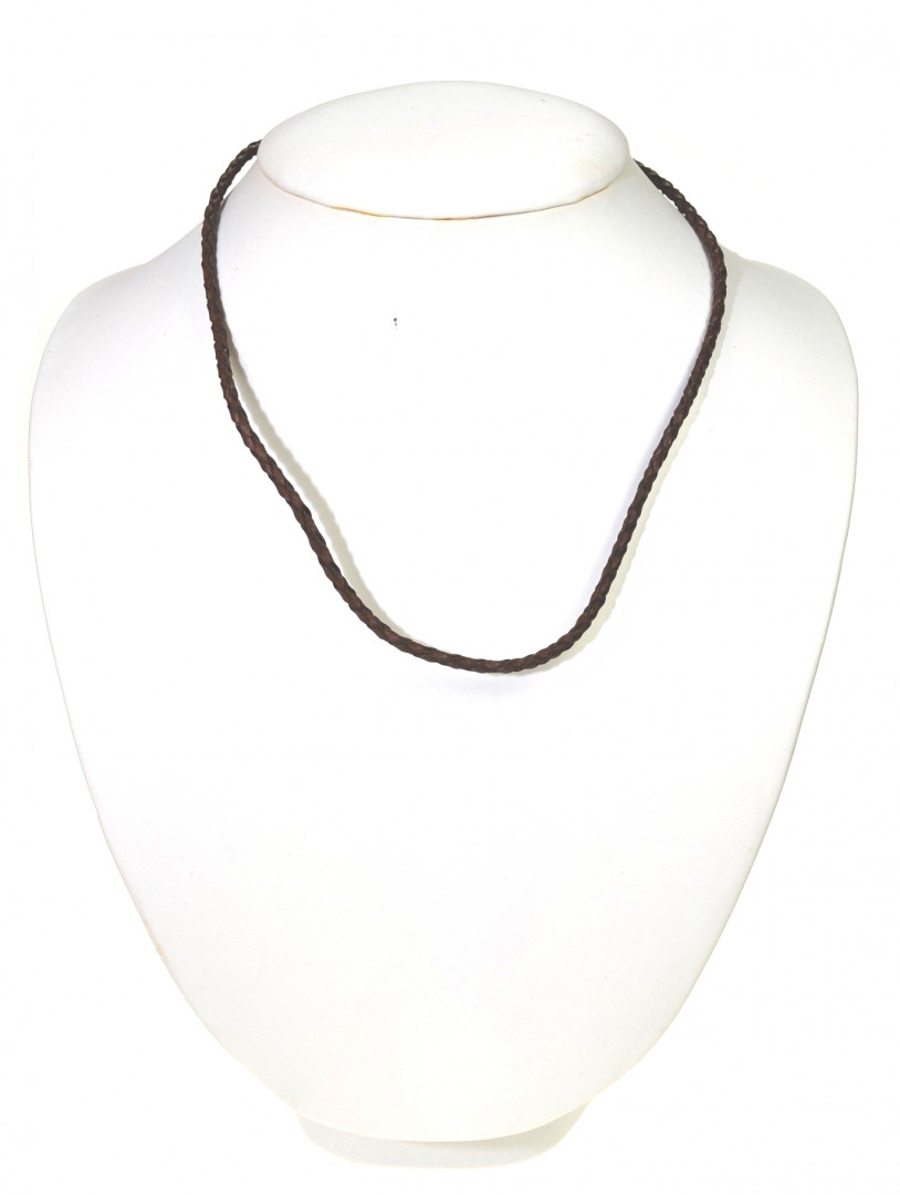 Tykk, flettet lærsnor med metallås. Brun, 3mm tykk.