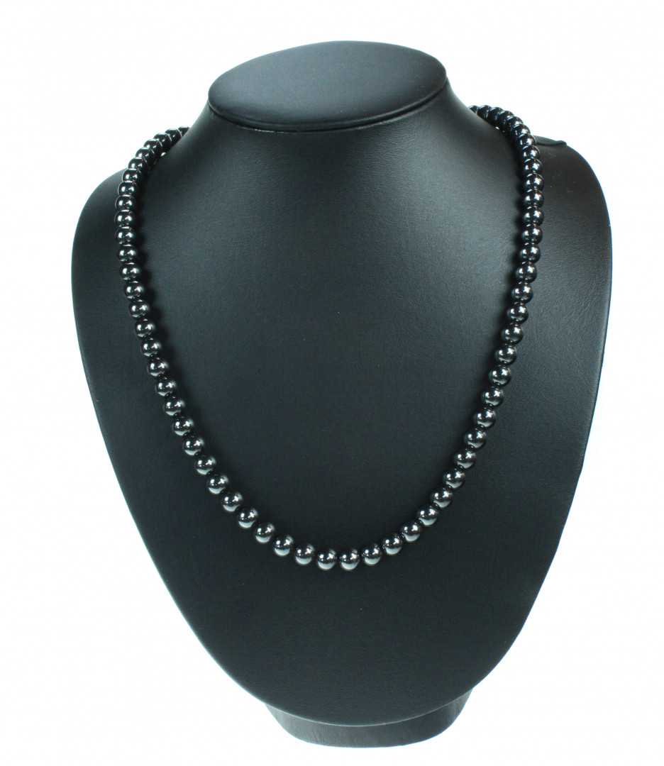 Halskjede med 8mm kuler i hematitt. 61cm langt med sølvlås