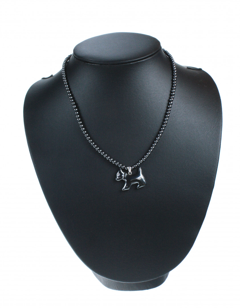 Kjede i hematitt med 4mm kuler og hundeanheng. 45cm langt med sølvlås.