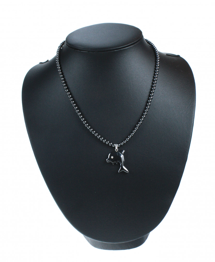 Kjede i hematitt med 4mm kuler og delfin anheng. Delfinens øye er en slipt kvartskrystall. 45cm langt med sølvlås.