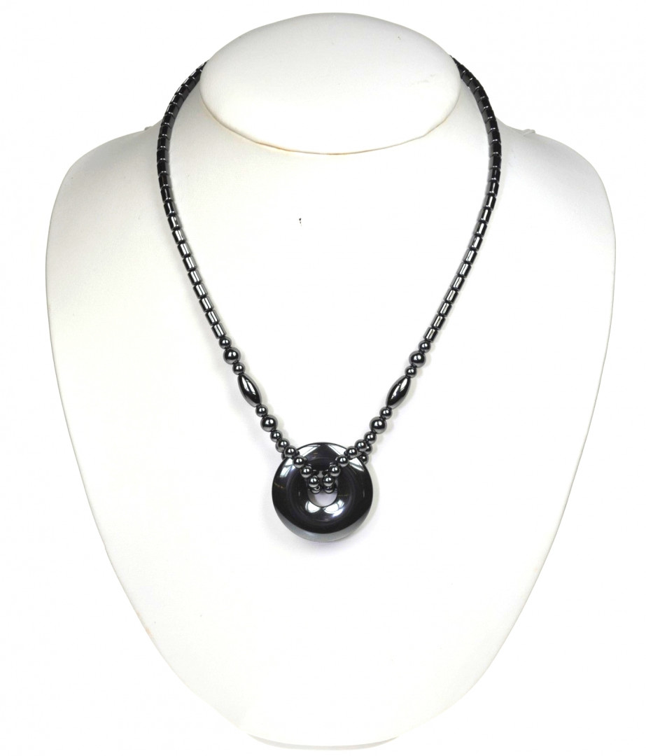 Hematitt halskjede med 5cm flat ring i hematitt foran. Kjedet gir et røft, men elegant inntrykk. Et unikt kjede som kan brukes til hverdag og fest. 45cm langt med metallås.