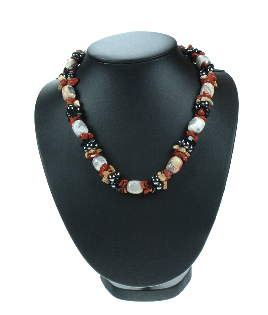 Kjede med store agat og kuler i hematitt. Kjedet har sølvlås