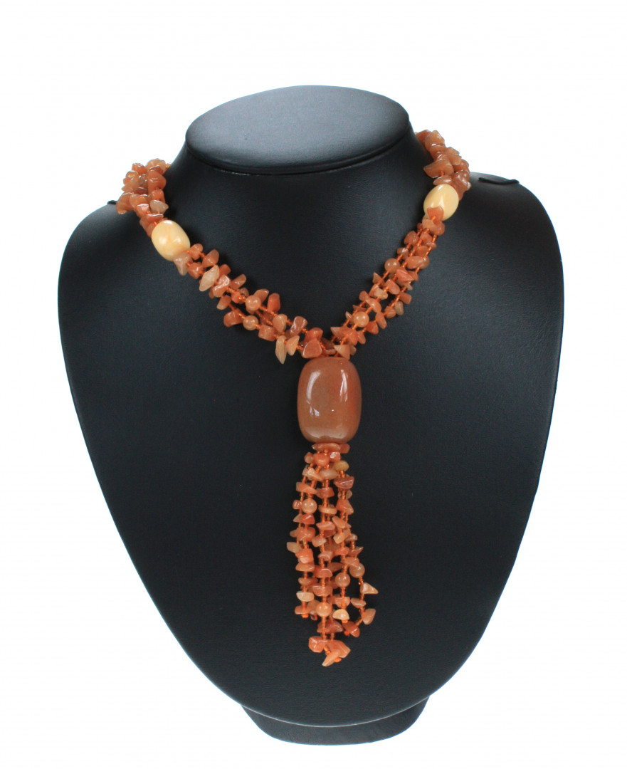 Chips-kjede i karneol med gule aragonitt med tre rader som samles i en stor stein. 61 cm langt.