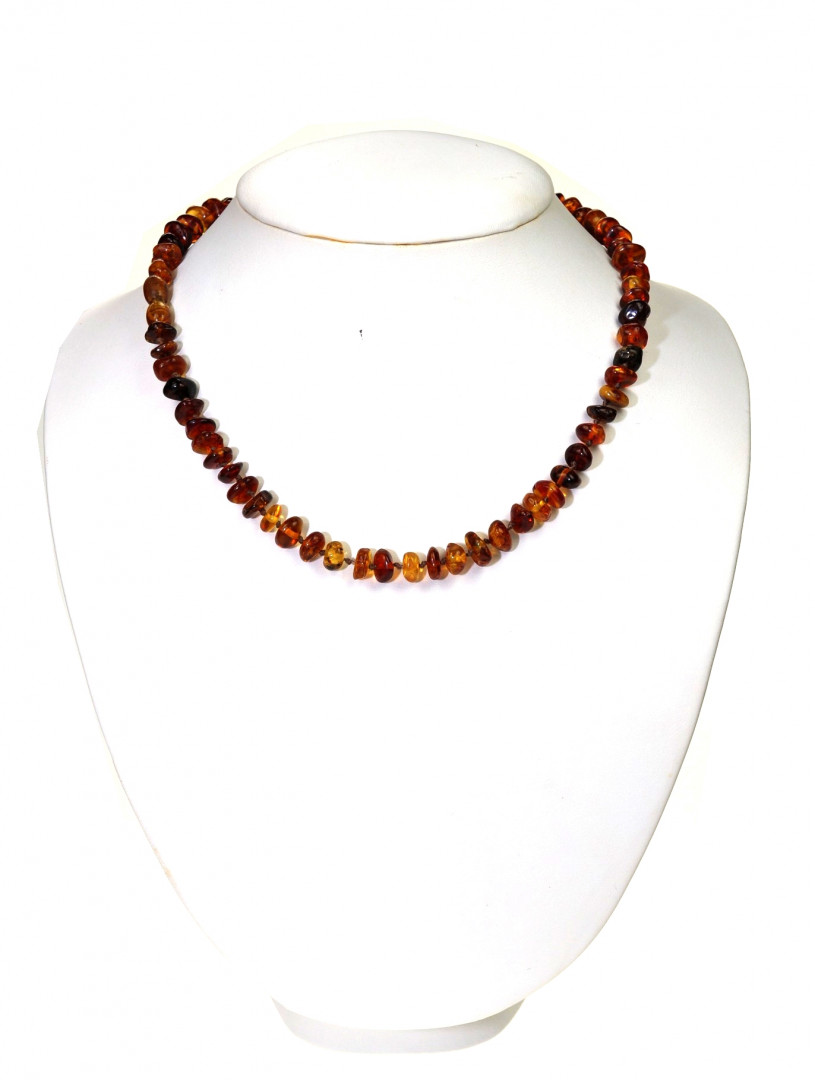 Kort halskjede med polerte, skinnende brune rav og skrulås.