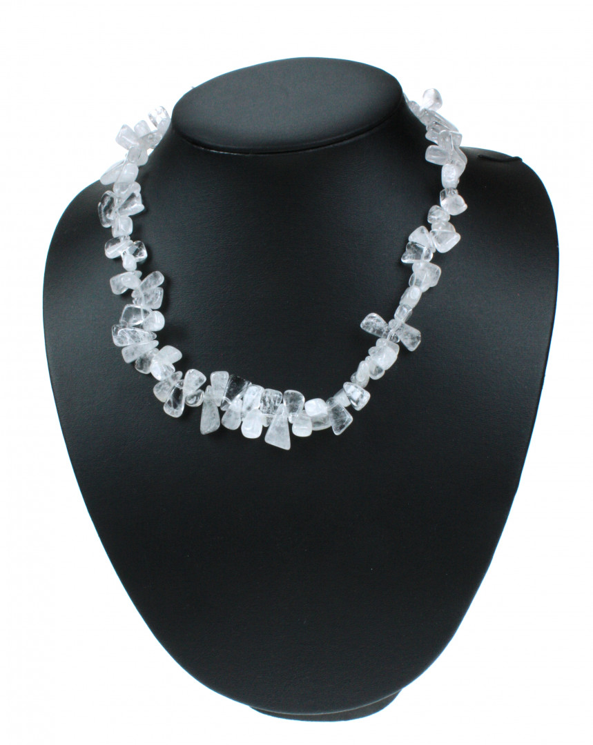 Kvarts halskjede med kraftige, uregelmessige chips i klar kvarts med sølvlås. Smykket er kort og gir deg en tøff og elegant stil. 45 cm langt.