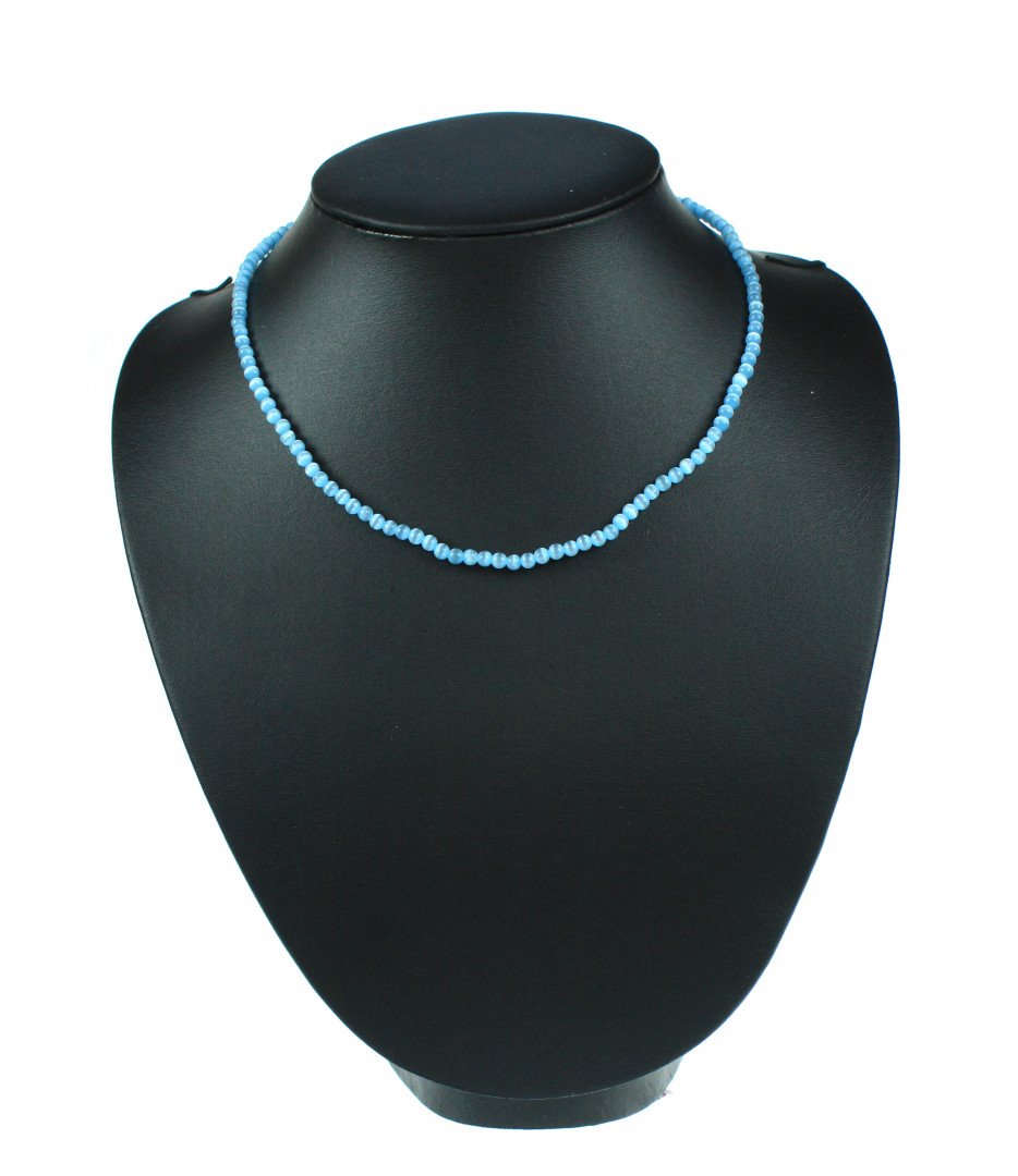 Lys blått cat`s eye halskjede med 4mm kuler. Kjedet er lett og har en frisk farge. Passer også godt til barn. 42 cm med sølvlås.
