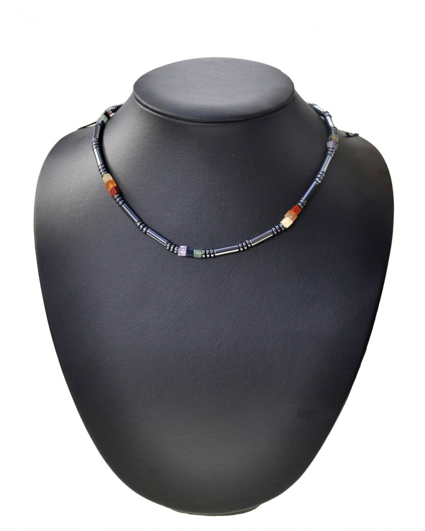Kort, morsomt kjede med små hematitt i forkjellig fasong sammen med små firkanter i karneol.