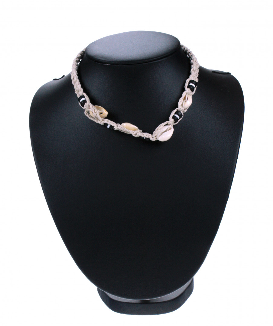 Kjede flettet med skjell og små sorte og hvite kuler.