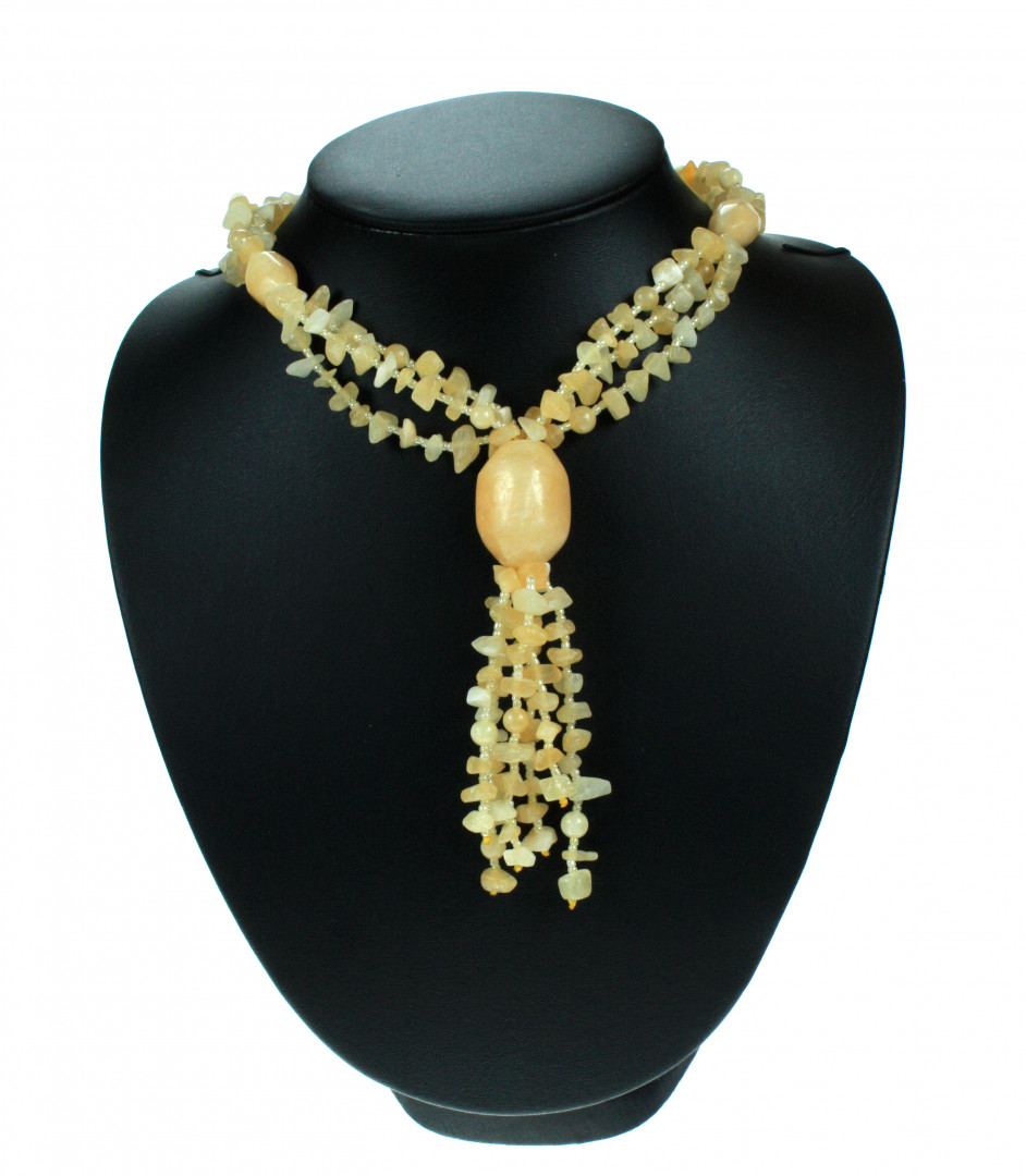 Halskjede med tre rader chipsformede, gule aragonitt som samles foran i en stor aragonitt. Kjedet har enkel metallås og er 61 cm langt.