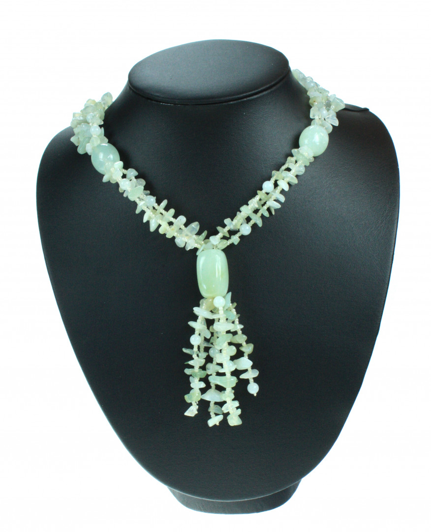 Chipskjede med tre rader i lys, grønn jade som samles foran i en stein. 61 cm langt med enkel metallås.